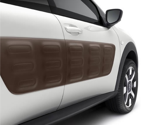 The air-filled Airbump panels, manufactured from thermoplastic polyurethane (TPU), can compress up to 20 mm, and bounce back to shape in an instant. Citroën notes that this will reduce the cost of vehicle ownership by reducing damage due to everyday bumps and scratches, such as those from shopping carts or the doors of other vehicles.