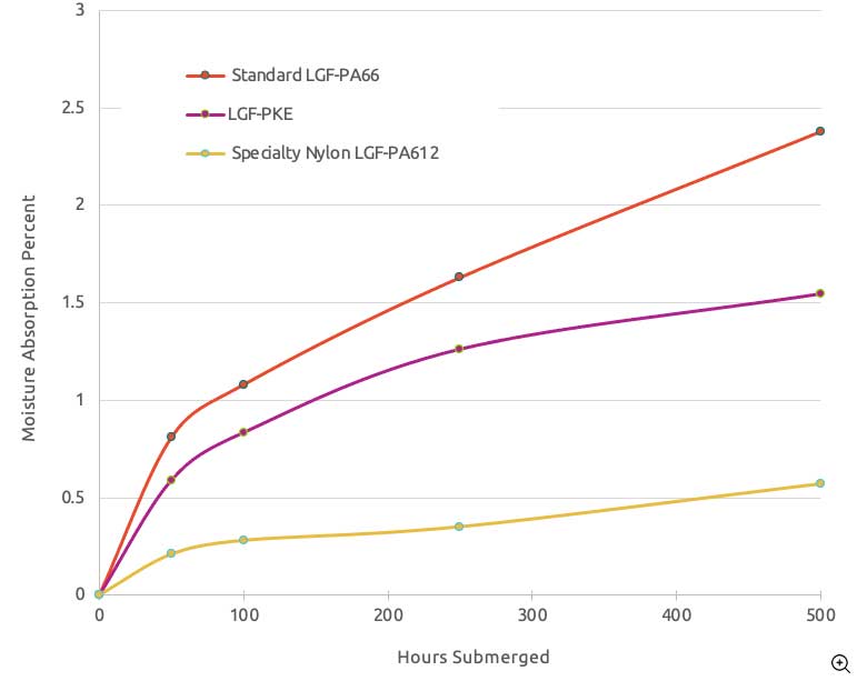 Complēt™ PKE polyketone formulations are long glass fiber reinforced polyketone solutions for structural applications using metal today. These materials are semi-crystalline and deliver excellent chemical resistance, low moisture uptake, and dimensional stability similar to nylon (PA6 and PA66). Polyketone has lower coefficient of friction, similar to acetal, giving it improved wear resistance.